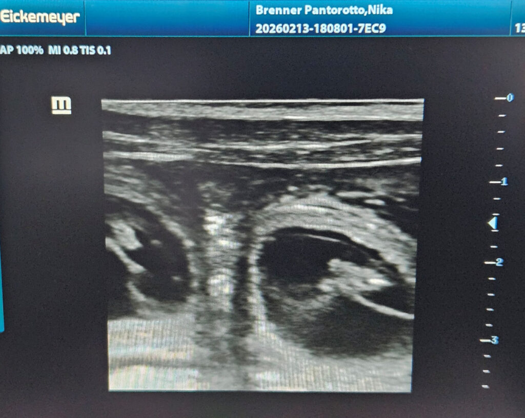 Heute konnten wir im Ultraschall bereits die kleine Q-linge beobachten. Ich dachte es wäre zu früh, denn es ist erst der 25. Trächtigkeitstag. Normalerweise lasse ich immer zwischen dem 28. und 30. Trächtigkeitstag nachschauen, ob meine Hündinnen trächtig sind, da wir aber die kommende Woche beim Tanzfestival in Rust sind musste ich es heute schon machen lassen.